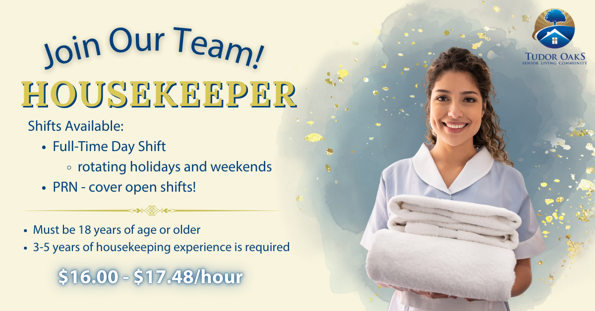 Begin a rewarding career—join Tudor Oaks Senior Living Community as a Housekeeper, serving the full campus of services, where your commitment and compassion will directly impact the lives of others!